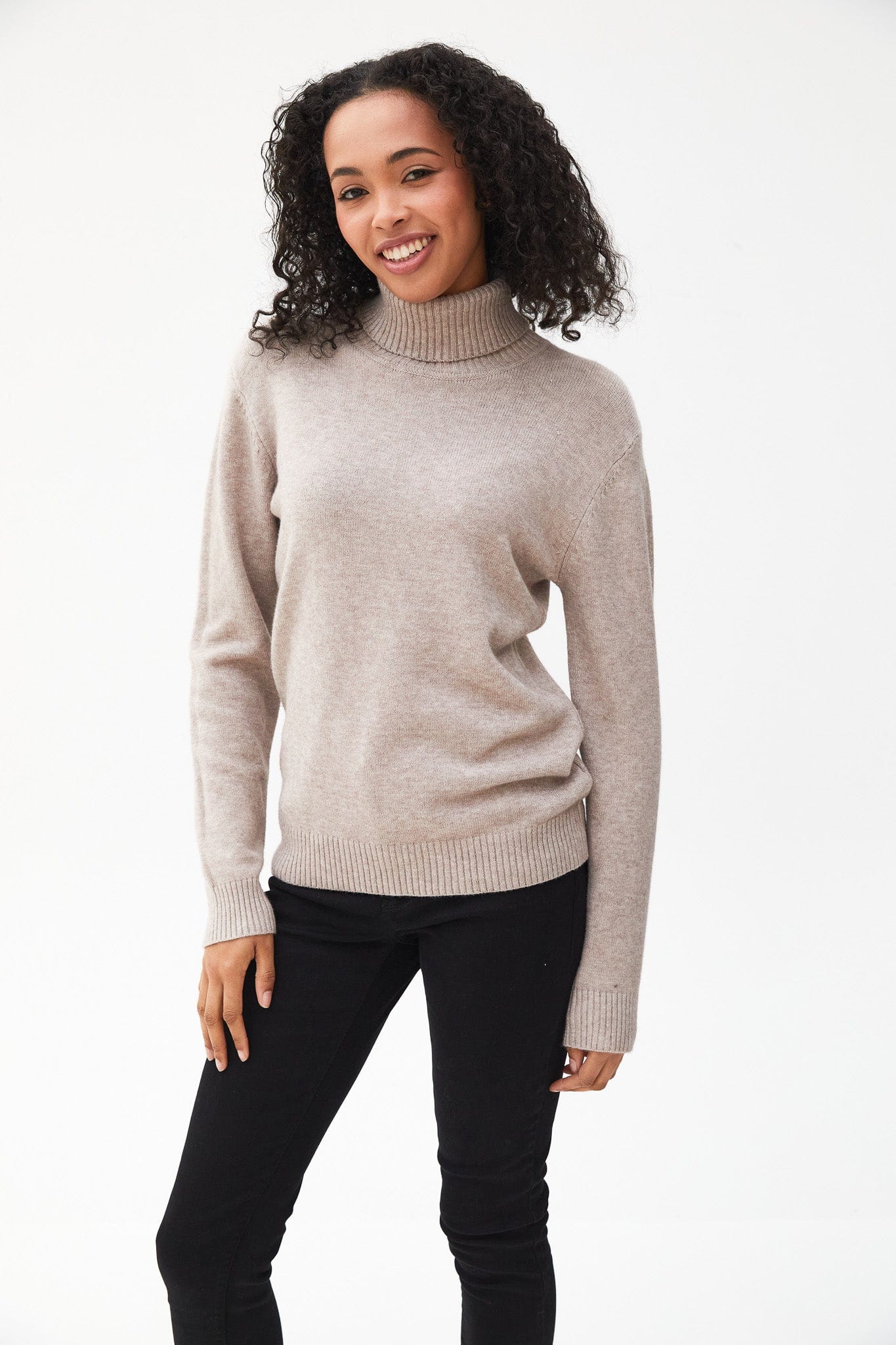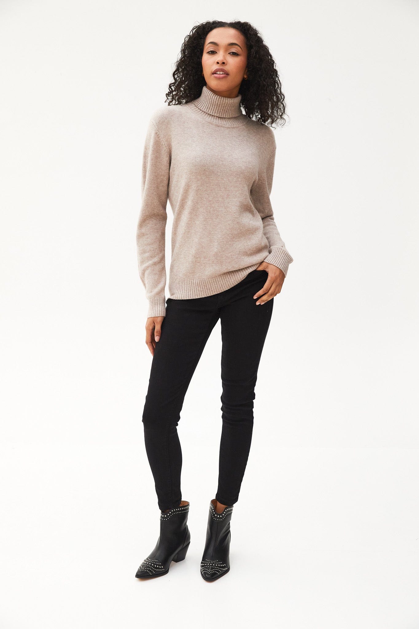 The Kartner fold-over turtleneck knit is an ideal layering piece that effortlessly complements both trousers and jeans for a polished look.