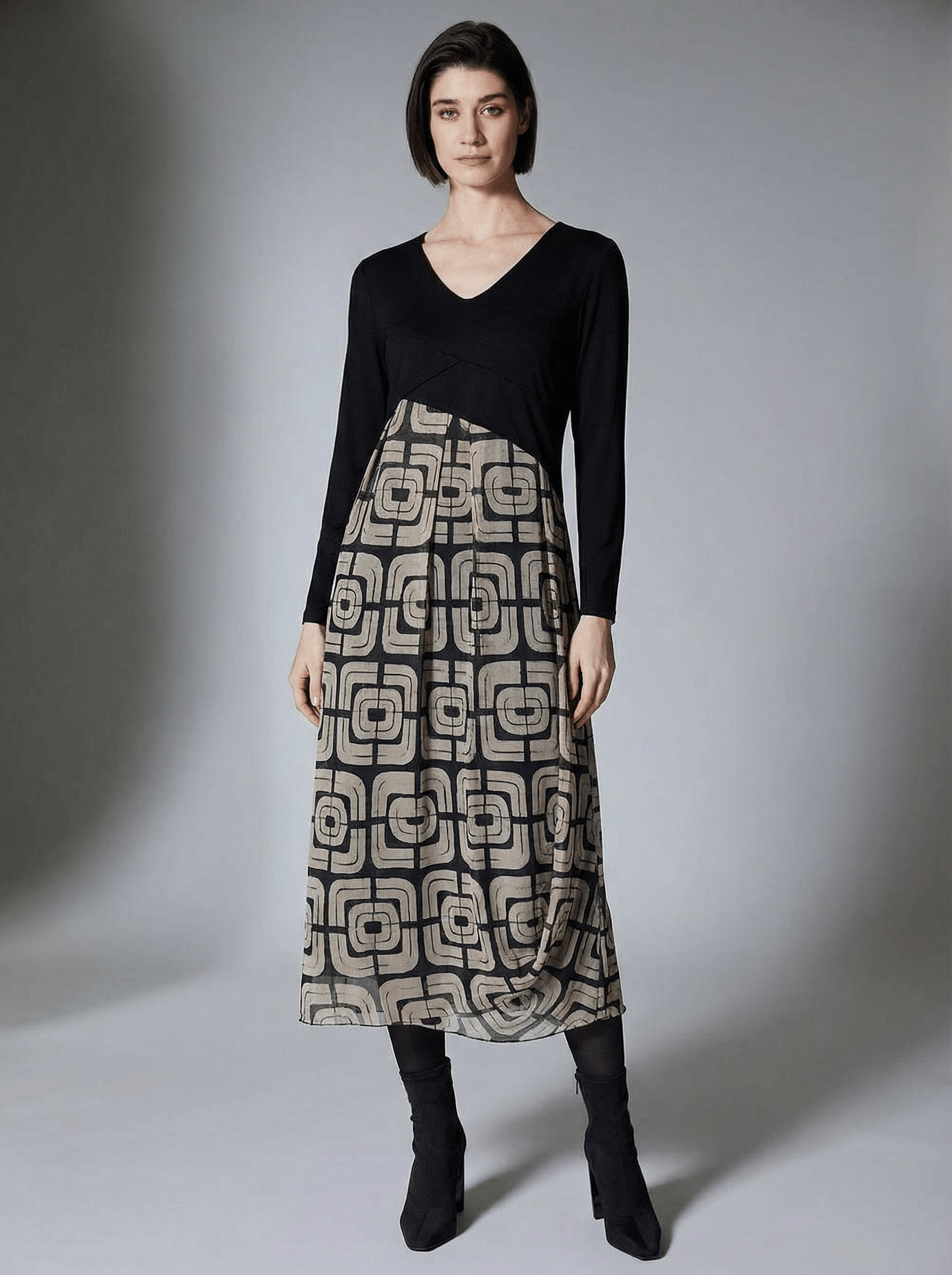 PERUZZI contrast fabric dress features a printed mesh hem and a soft jersey top, blending texture and style for a modern, sophisticated look.