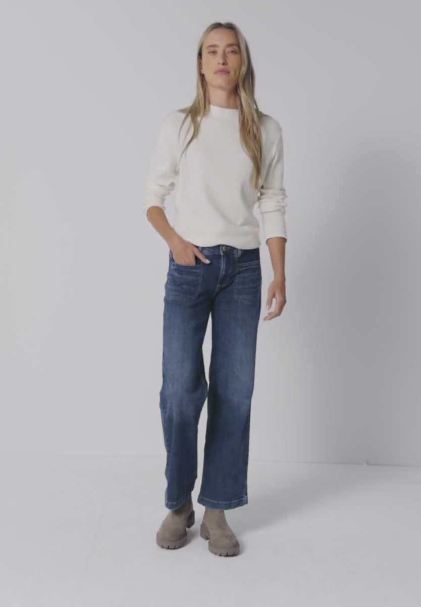 These wide-leg jeans for women from Street One, in a casual fit, feature a mid-waisted design, patch pockets, and a cool blue wash. The cotton blend with added stretch ensures comfortable wear.