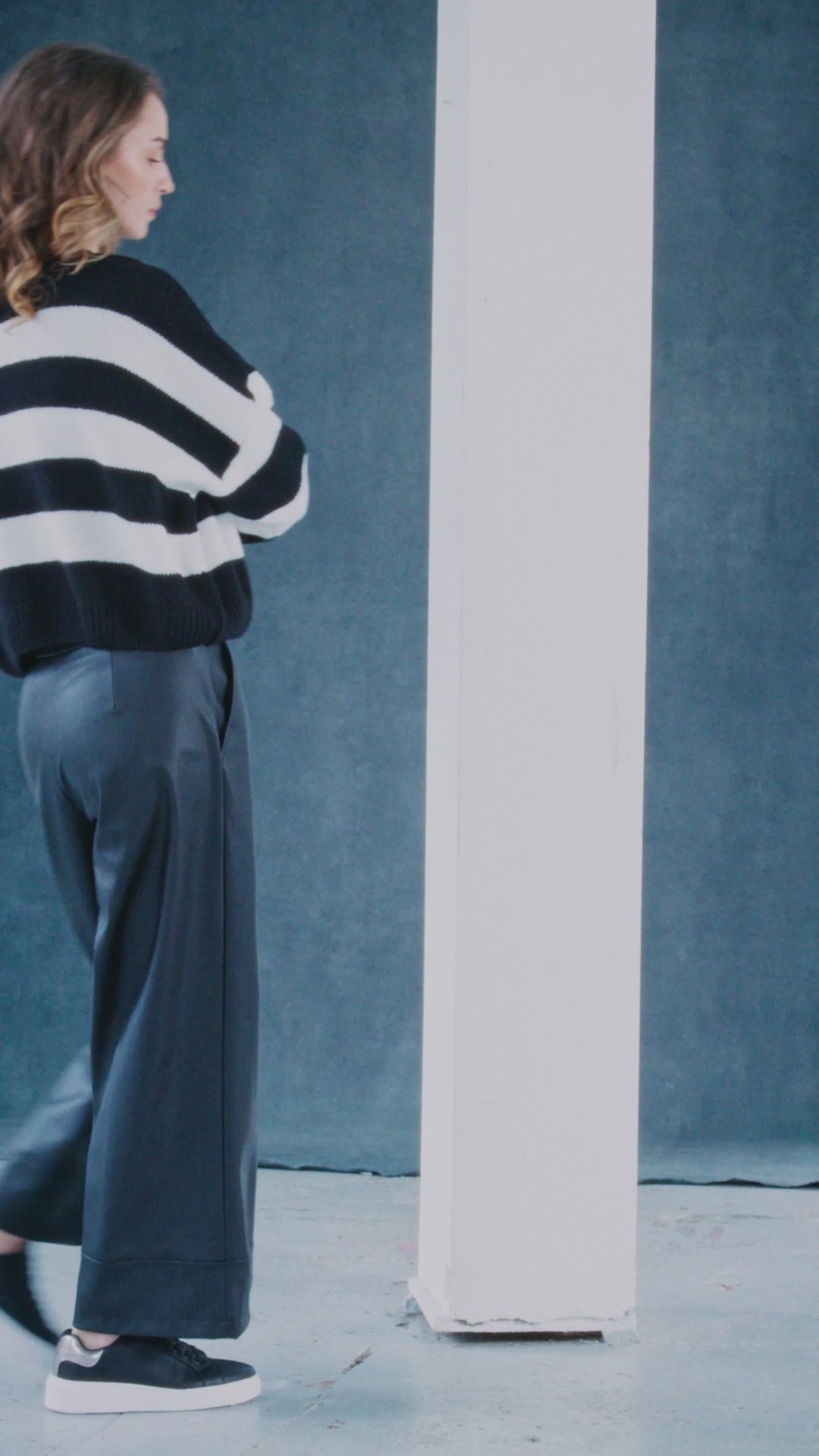 NAYA wide leg pleather culotte features deep cuff and front button detail. Styling in proportion, they hug the body and finish loosely at the hem with a deep band.