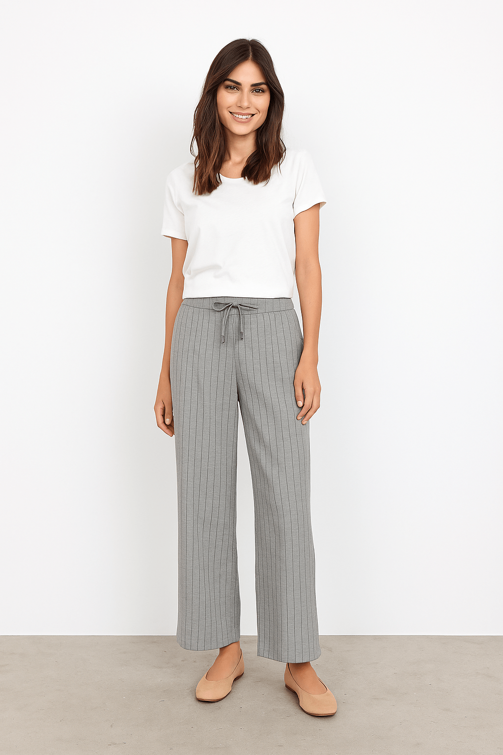 Soyaconcept stripe relaxed trouser They feature a relaxed fit with subtle pinstripes and an adjustable drawstring waistband, offering a comfortable full-length design. Pair them with a fitted top and sneakers for a casual look.