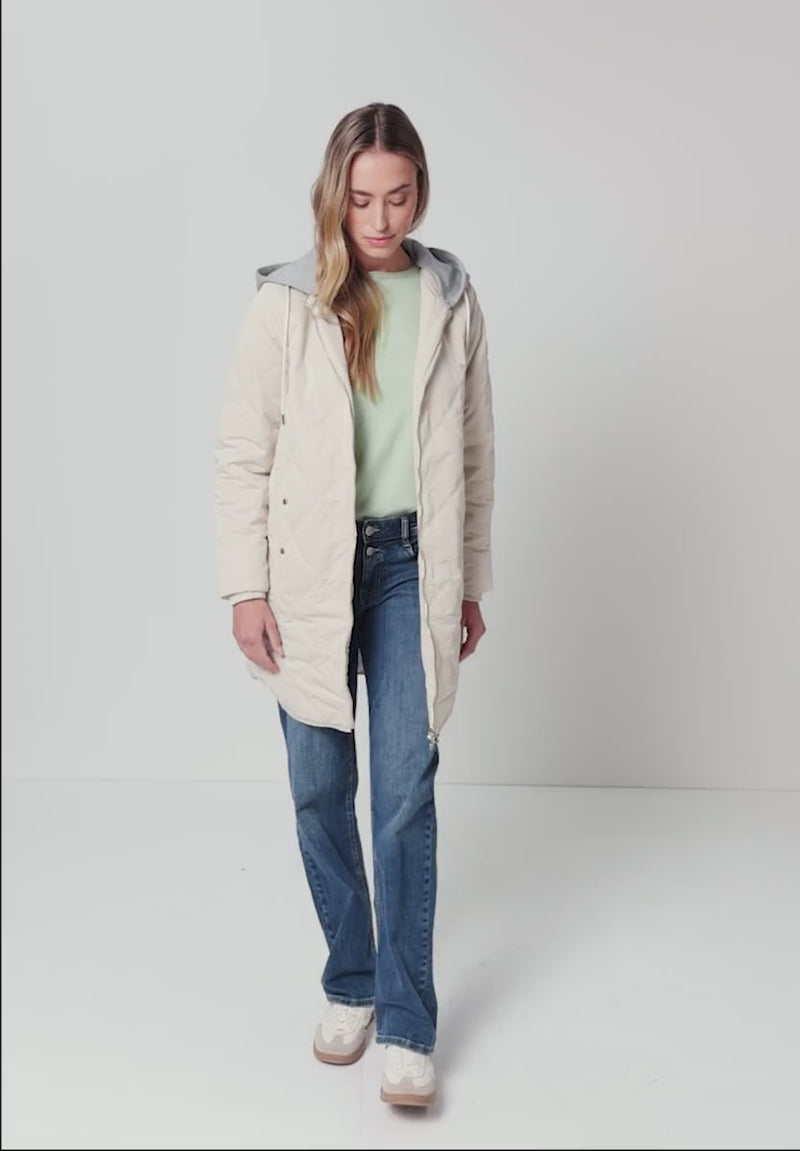 Street One diamond quilt jacket has a striking diamond quilt texture that creates visual interest while the removable jersey hood with drawstring offers flexible styling options. A two way zipper offers seamless transitions between seasons, complemented by tailored long sleeves with structured cuffs. Discreet side pockets provide practical convenience without compromising the coat's elegant aesthetic.