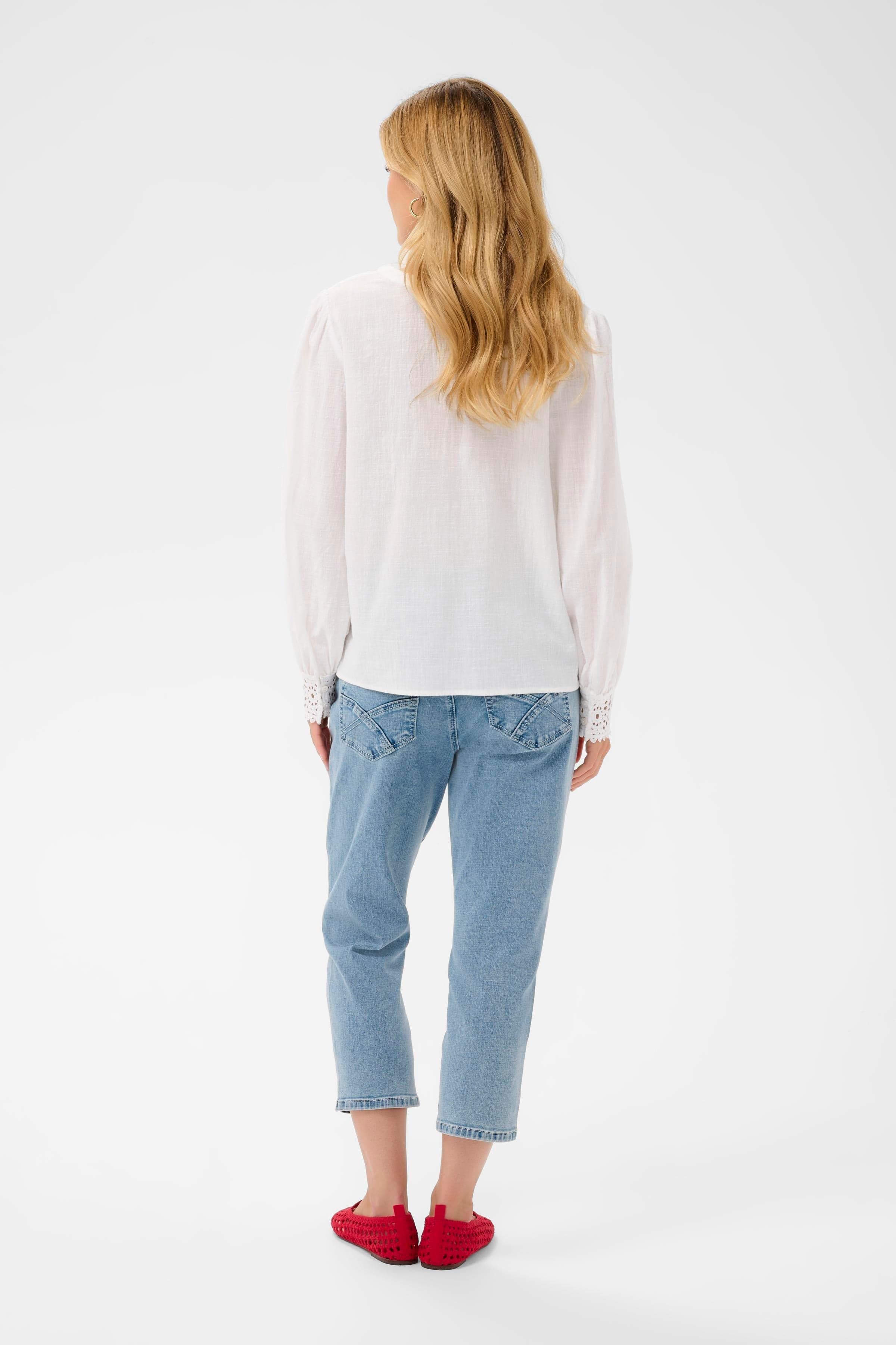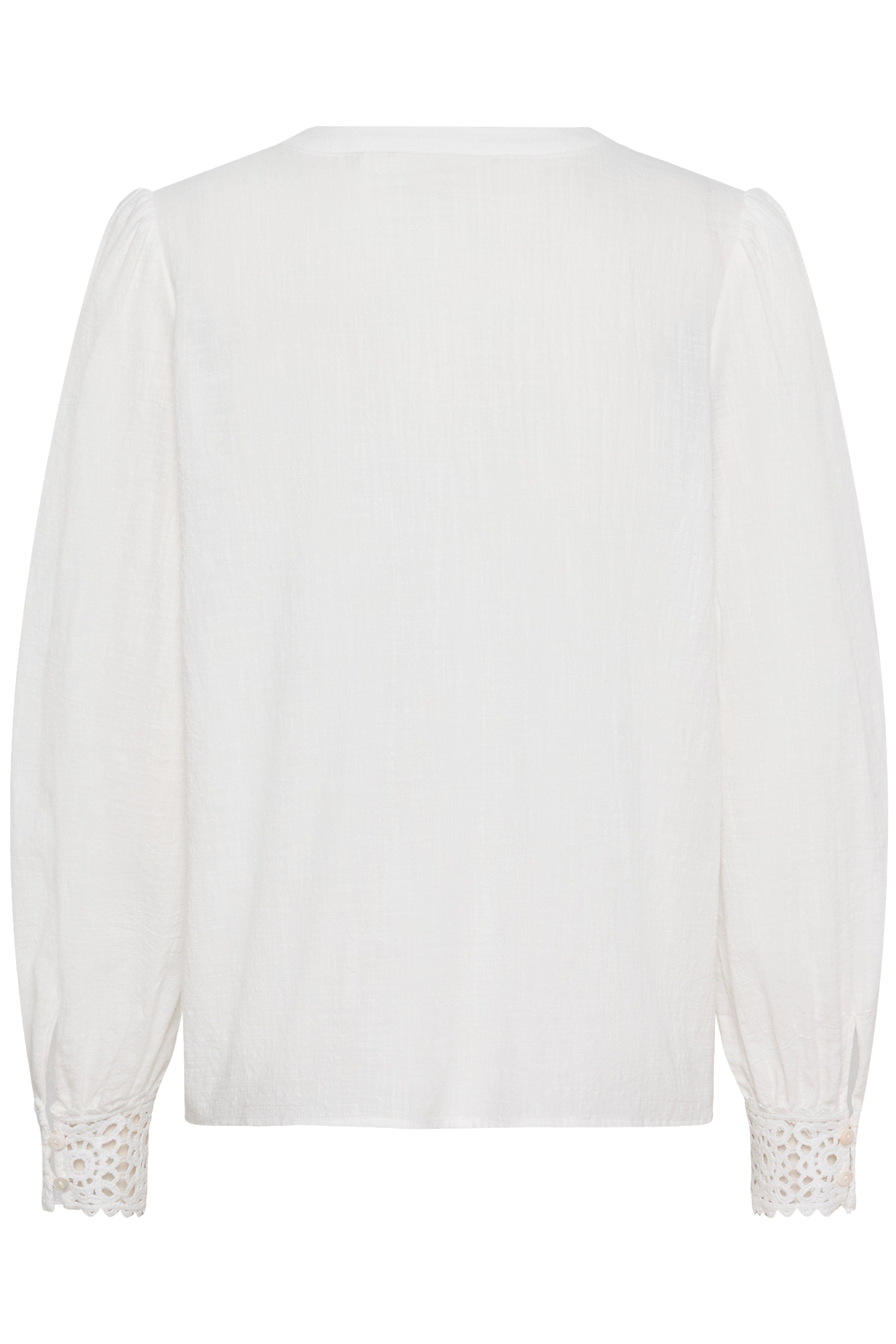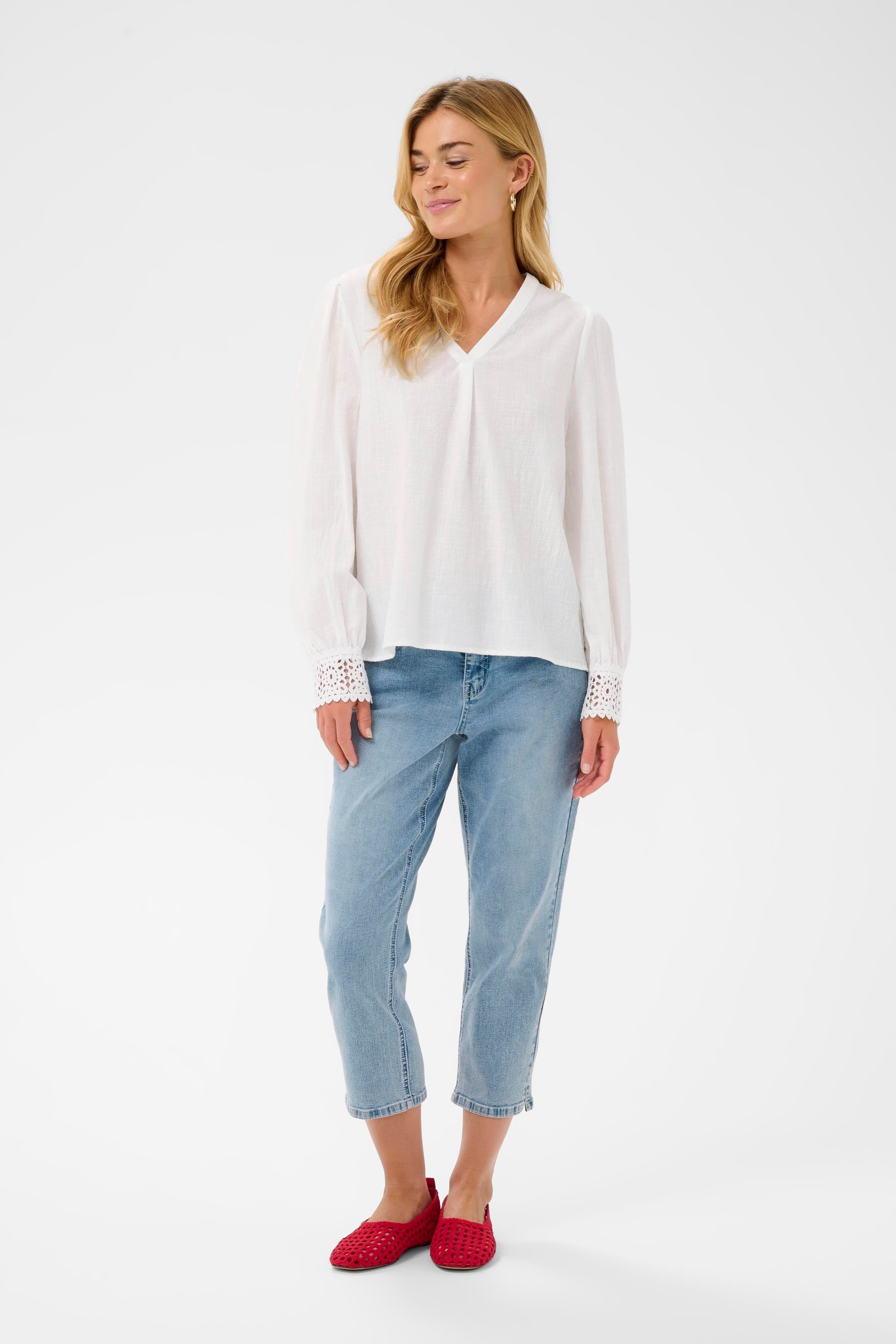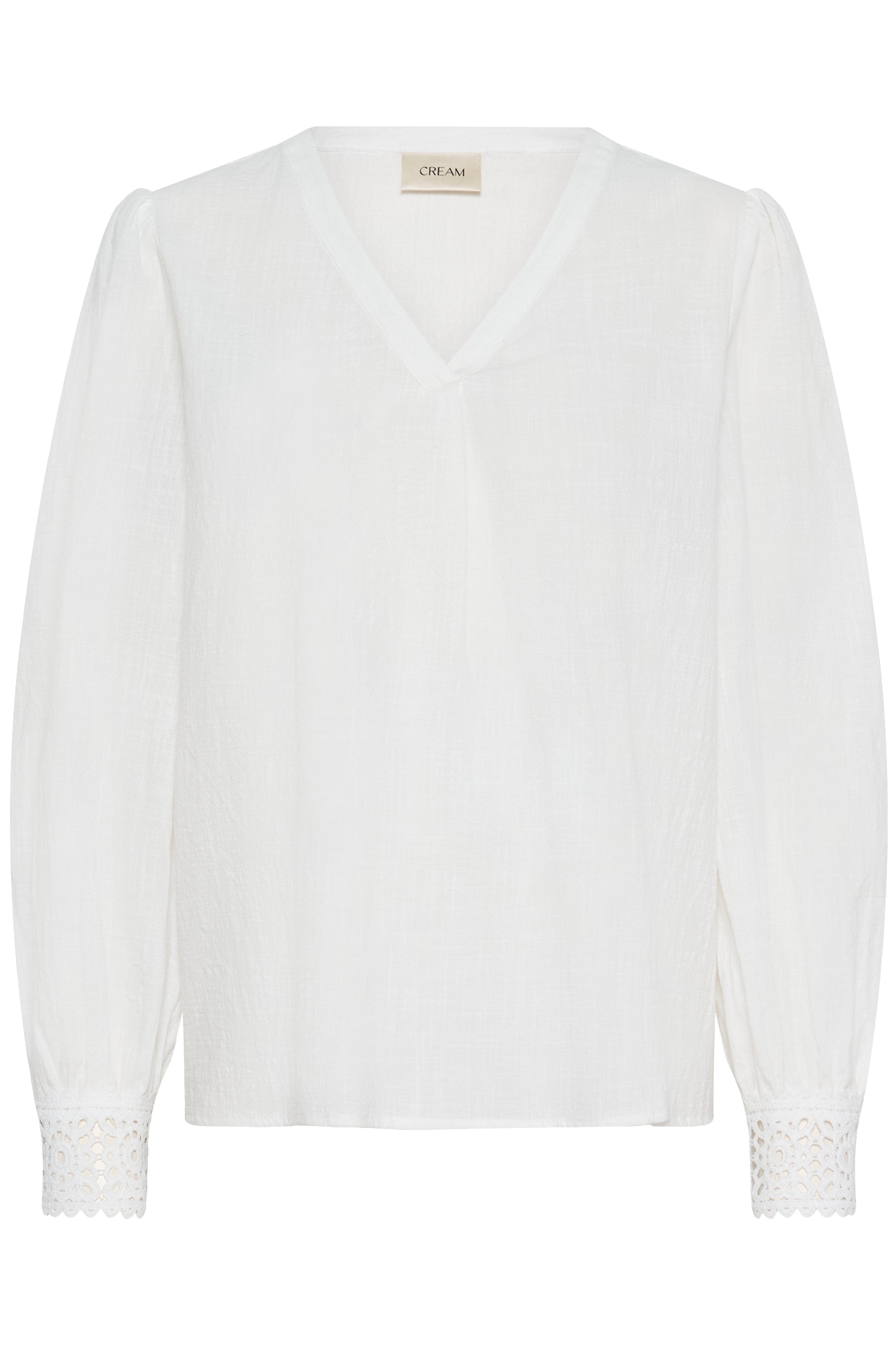 Spring is the perfect time to invest in a versatile blouse that never goes out of style. The CREAM lace detail blouse features a flattering v-neck, airy puff sleeves that end in a crochet lace finish that cuffs the wrists, as well as a crispy white finish.