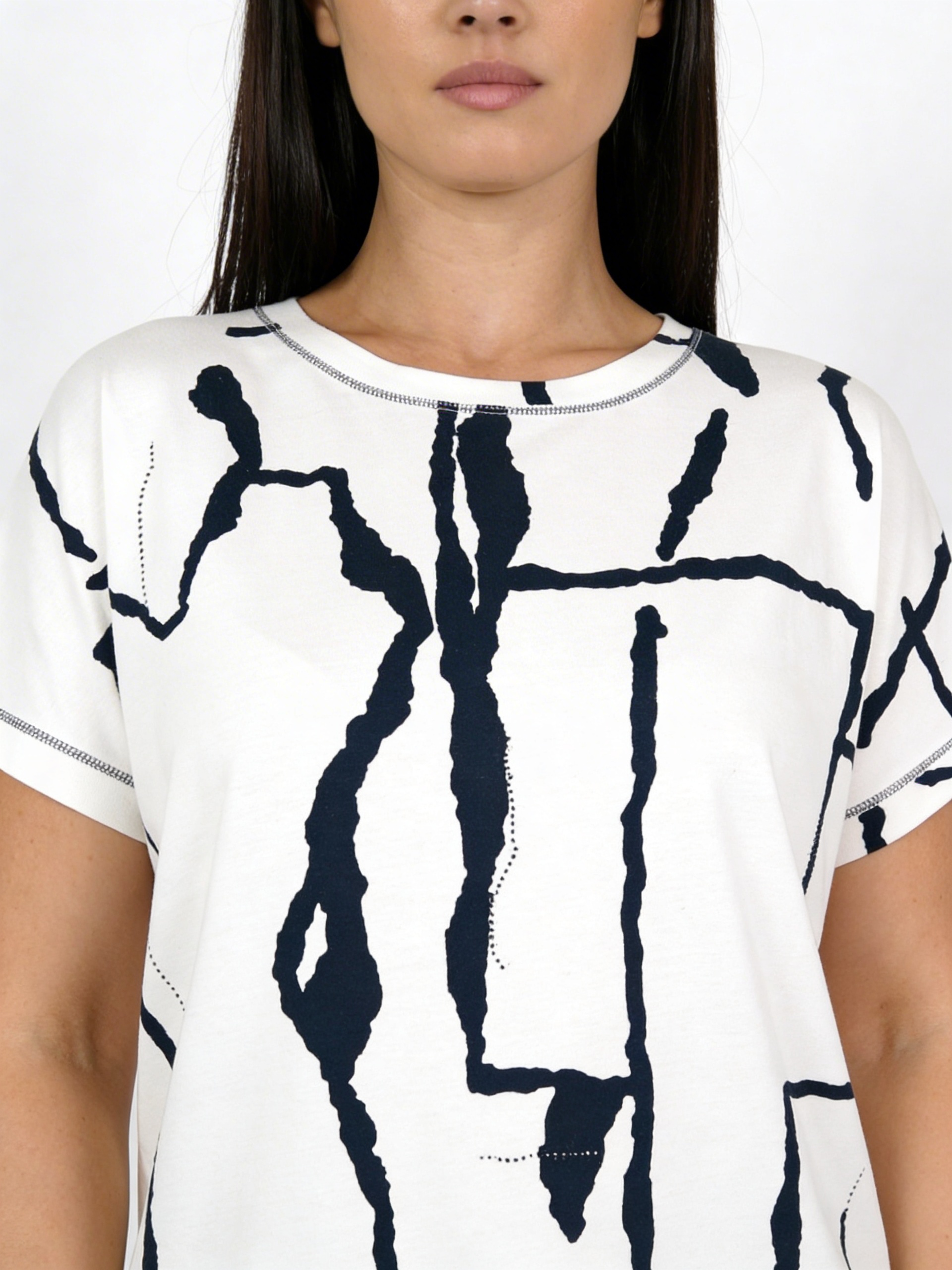 The Kartner abstract print top features a cracked mirror effect print in a flattering off-white and navy colour; with short sleeves and a round neckline, this piece is perfect to add to your wardrobe this season.