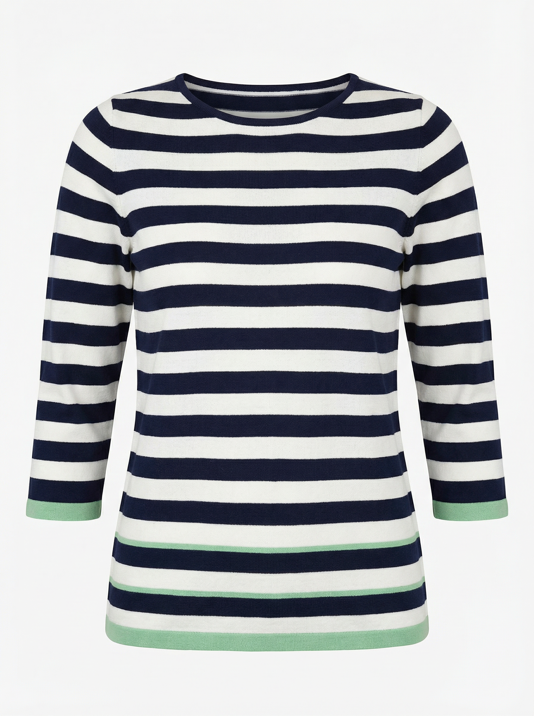 The Kartner fine knit top features a three quarter sleeve and a flattering round neckline, the pattern consists of stripe detailing with a pistachio coloured trim on the hem and sleeves.