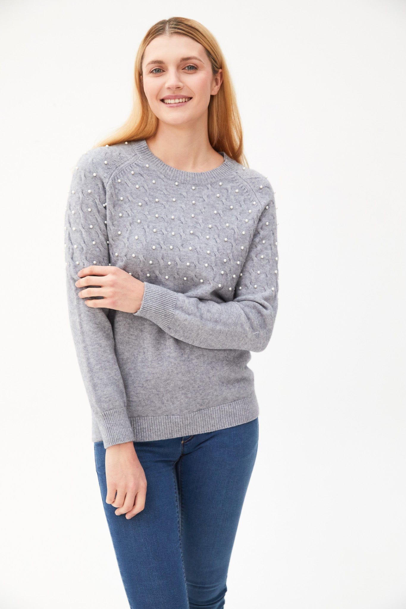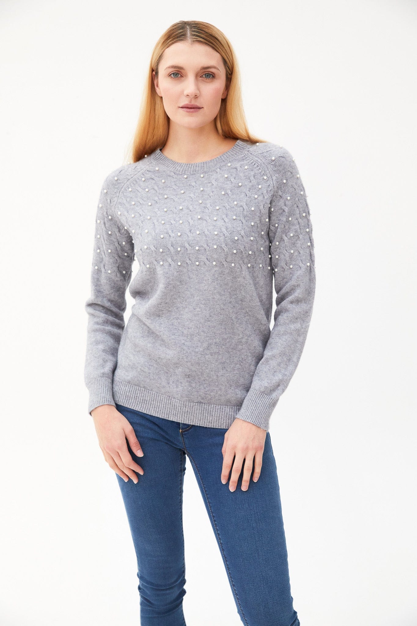 Kartner pearl sweater combines timeless style with comfort, featuring a beautifully mixed cable knit design that adds texture and depth to your look. Its classic round neck offers a flattering fit, perfect for layering or wearing on its own.