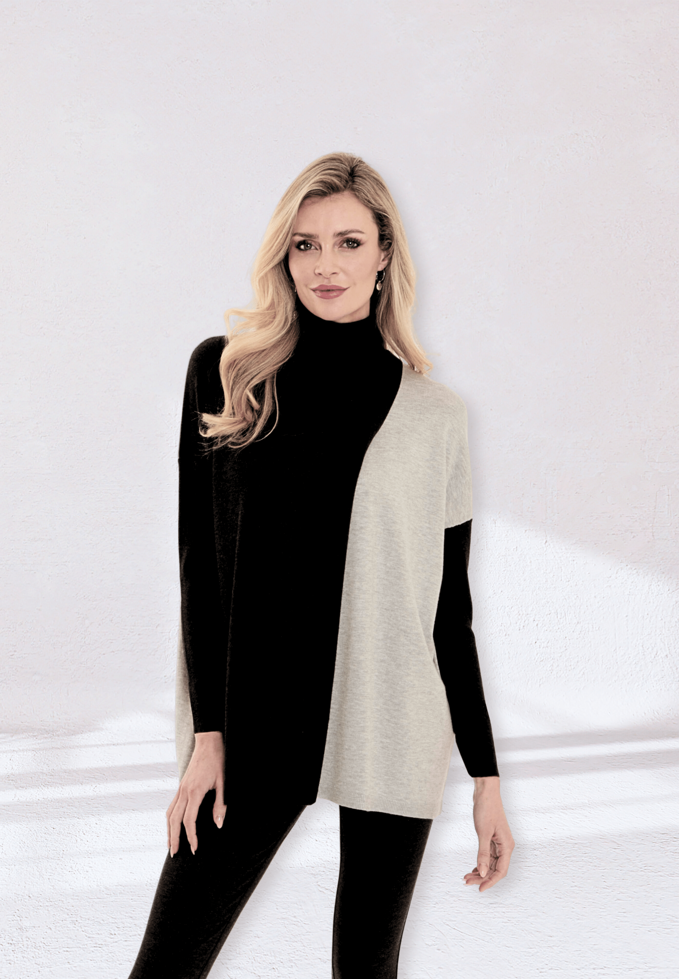 Pomodoro two tone poncho features a fine turtleneck and bold contrast block design in a dark grey and beige colourway, effortlessly refined with a modern twist. Crafted on a super soft viscose yarn mix and in a generous loose silhouette. The neat roll neck and long sleeves are super flattering.