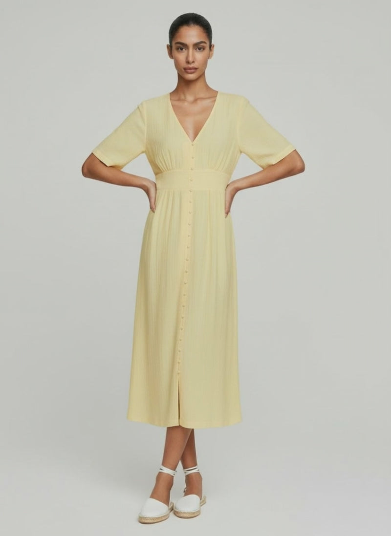 MSCH sundress in soft yellow dress features a v-neckline with a full button closure, a sinched waist and short sleeves.