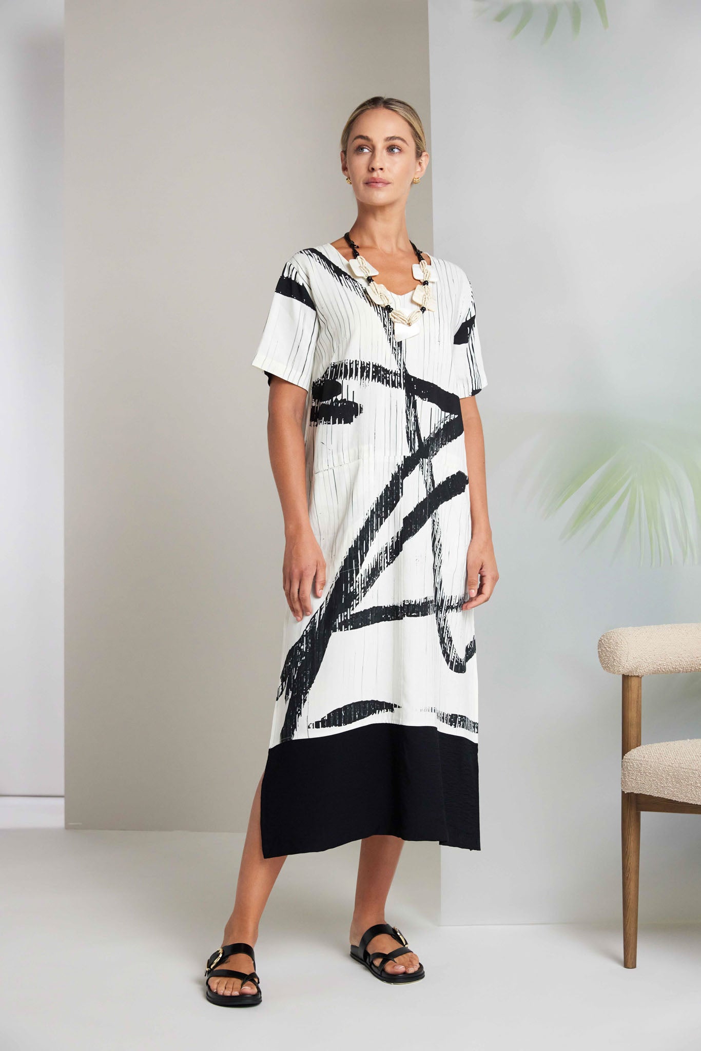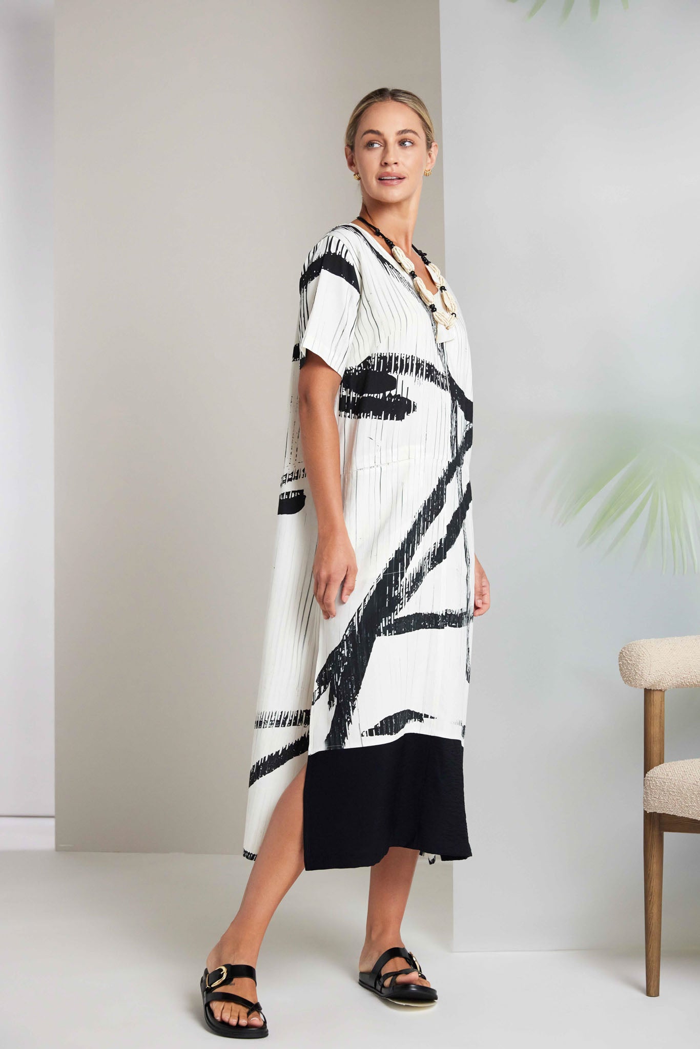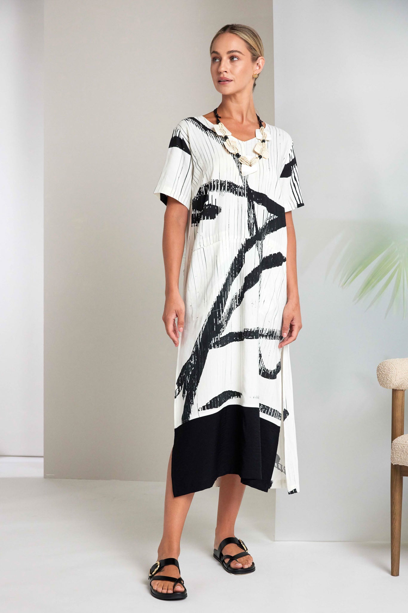 NAYA absolutely shine this season with their brush print multiline dress. Never shying away from extraordinary design this NAYA print is lavished from shoulder to hem. The cut is classic with a scooped neck, short sleeve and border hem.