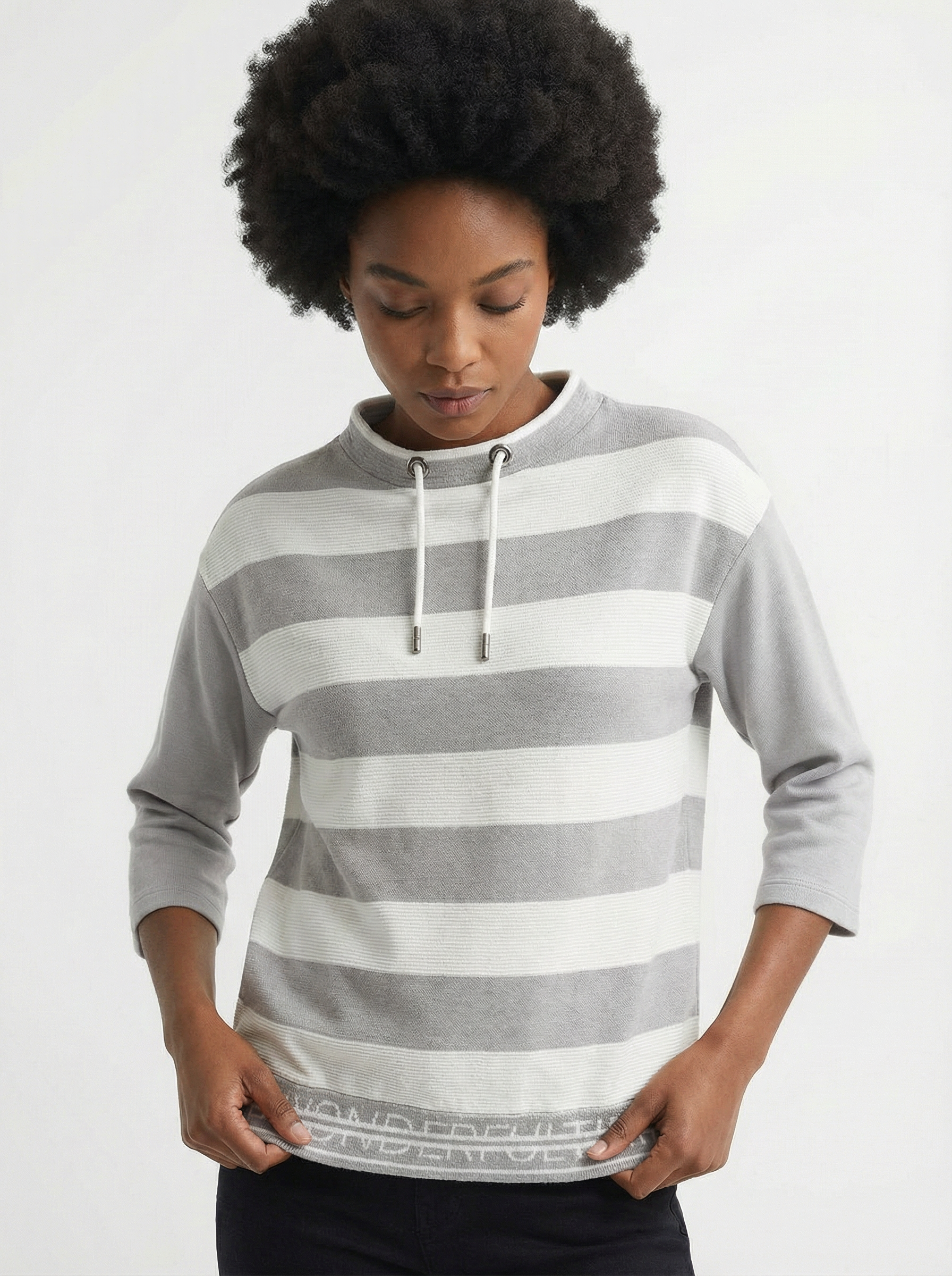 The Barbara Lebek rib detail top is the perfect layer for the season ahad, its its drawstring neckline and quarter sleeves, its a feminine sporty-inspired piece that can be easily be worn leisurely or elevated with blue jeans.