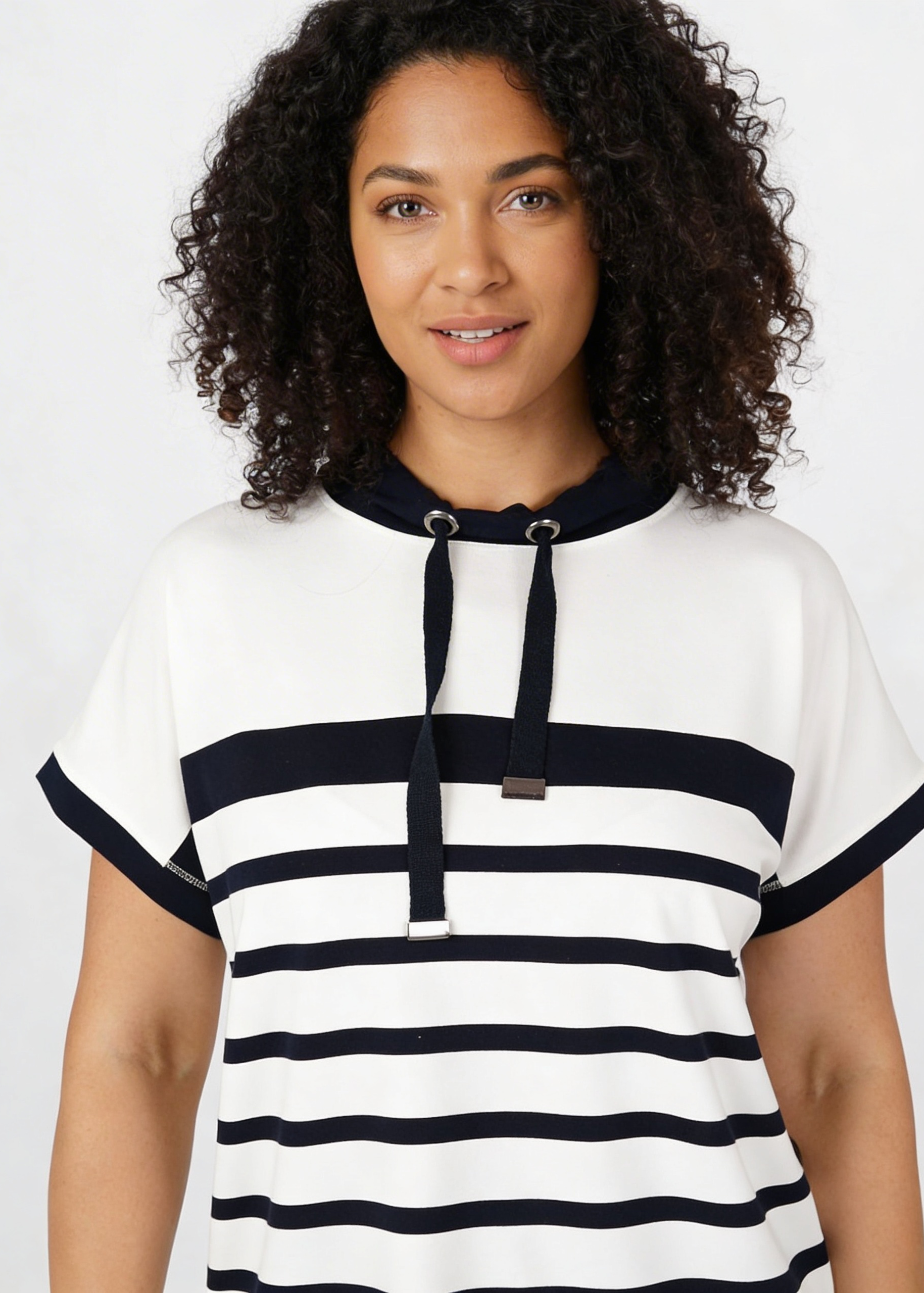 The Kartner tie detail top features a functional tie-neck detailing on a flattering round neck; with short sleeves and a stripe print with trim sleeves, its the perfect piece to pair with denim this season.