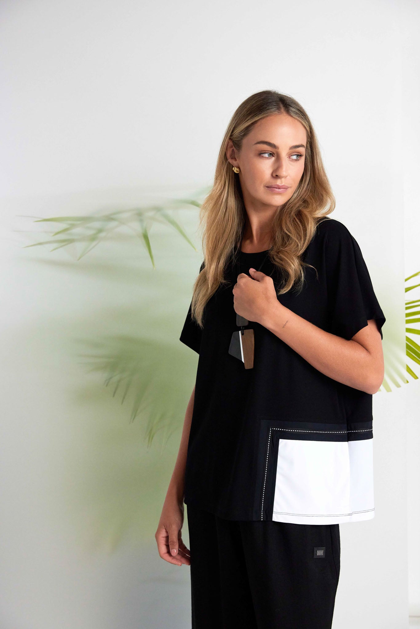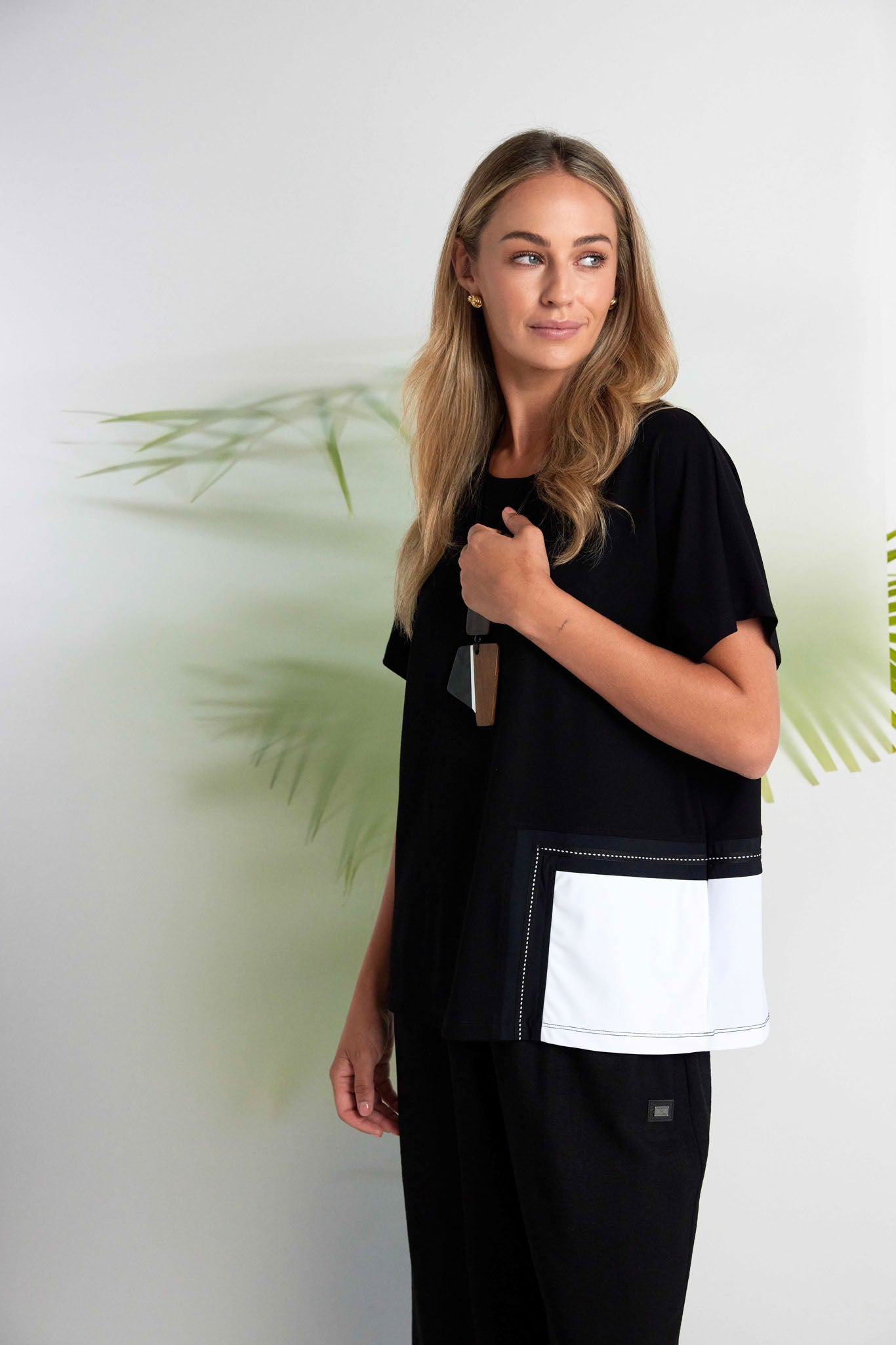 The NAYA stitch detil round neck top with short sleeves is playfully layered with an angled patch and contrast stitching to one side of the hem. This unique insert brings a signature flourish from NAYA designed for you to feel special.