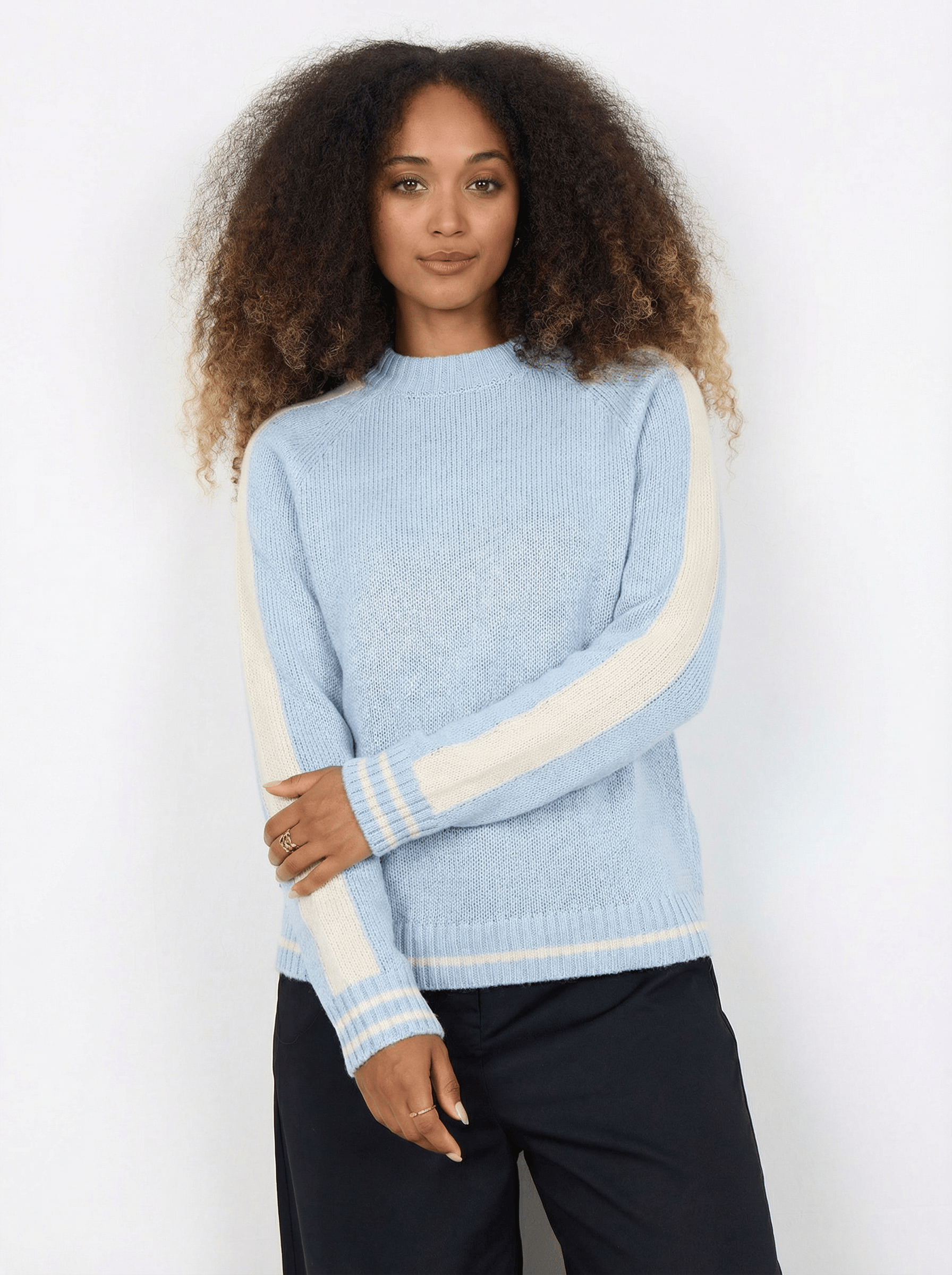 Refresh your wardrobe with this charming knit, where soft blush rose and baby blue stripes create an effortlessly spring-ready look. The delicate colour combination captures that perfect seasonal transition moment, making it an instant favourite for layering or wearing solo. Playful yet polished, this knit top brings a touch of understated elegance to your everyday rotation.