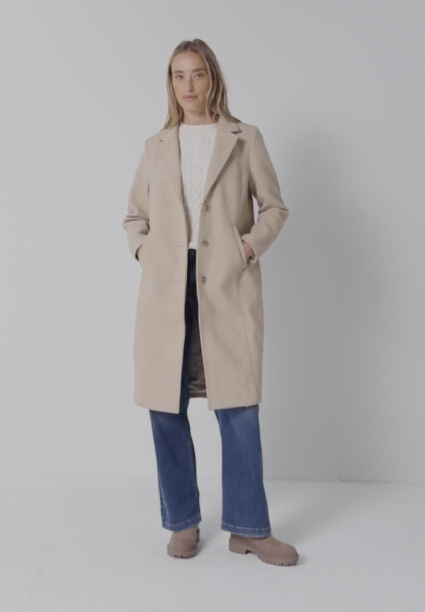 This long, lapel coat from Street One for women features a lined inlay and hood, ideal for changeable weather. The elegant wool look and classic button placket give the coat a stylish appeal. Side pockets offer practical comfort and complete the design.