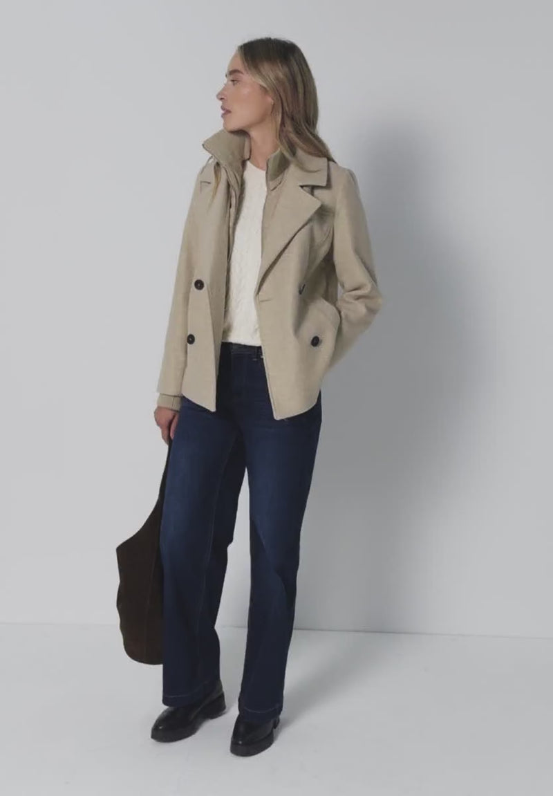 This women's coat from Street One impresses with its modern layered look and smart design. The removable quilted inlay with a stand-up collar provides pleasant warmth and can be worn flexibly depending on the weather. With classic buttons, side pockets, and cuffs, the jacket is a stylish companion for transitional seasons.