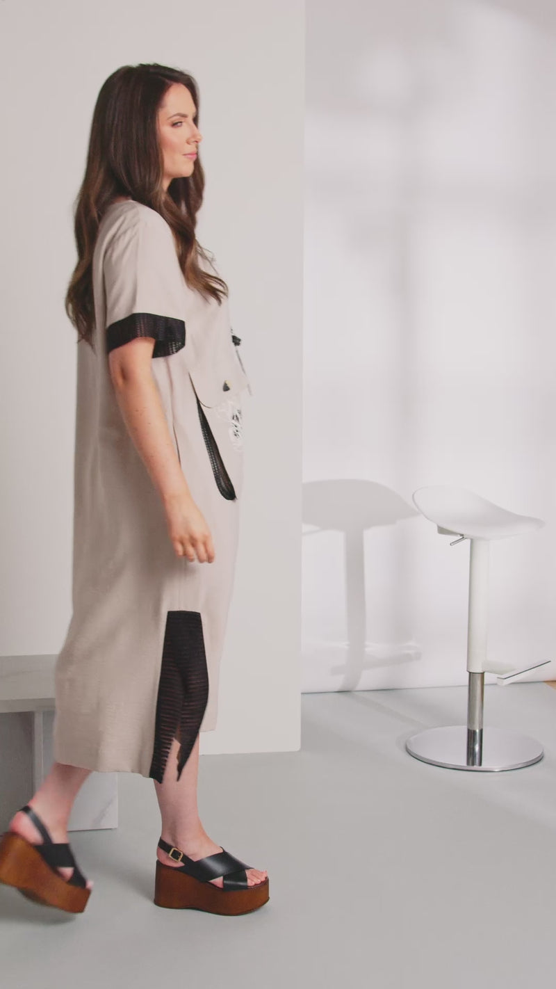 ORA take the classic long line round neck dress and inject a little sporty style. Mesh inserts have been added to the side panels and also trims the short sleeve cuffs. One singular patch pocket has been applied to the bodice with a very fine floral print.