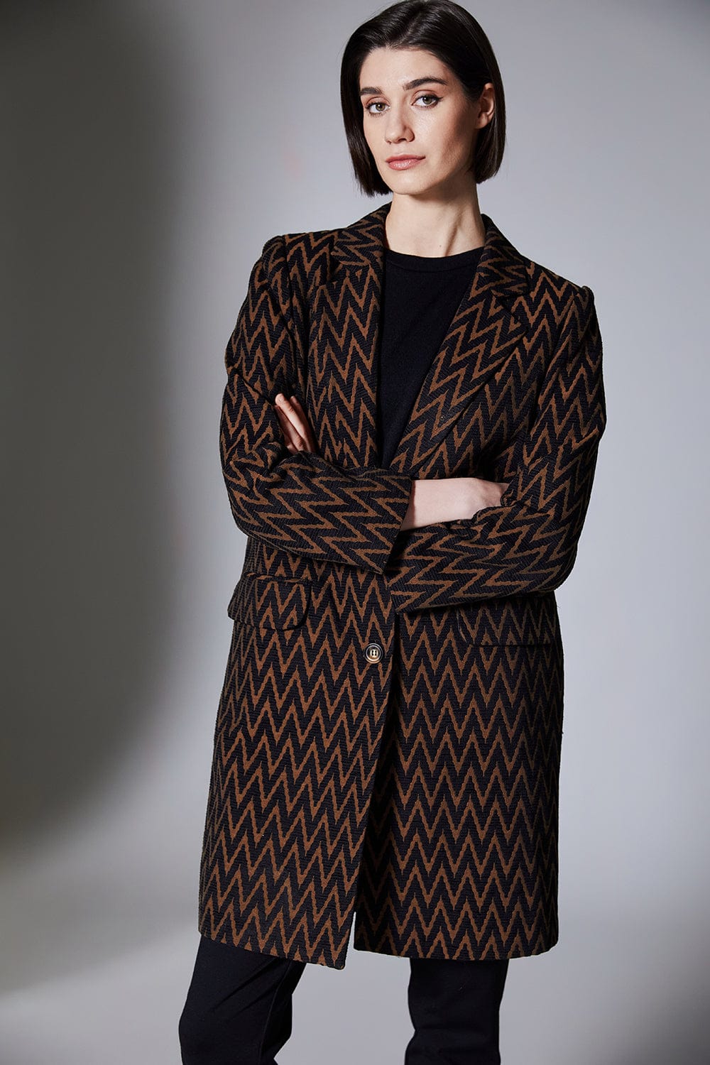 PERUZZI zig zag coat has a black and brown chevron pattern. Designed with a notched lapel collar and single-button closure, it offers a longline silhouette for extra coverage. Featuring flap pockets, structured shoulders, and a tailored fit, this coat combines style with functionality.
