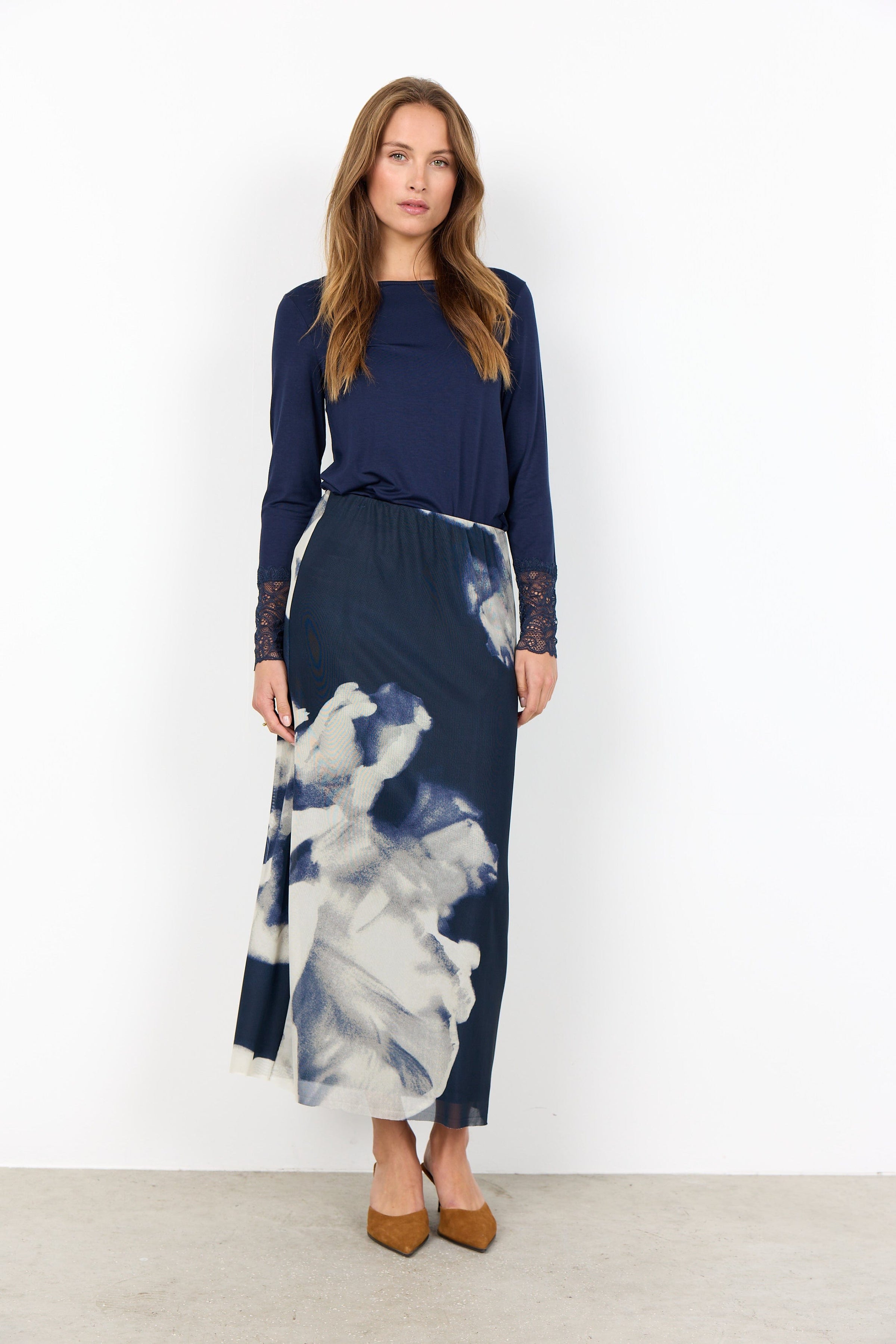 The Soyaconcept mesh skirt showcases a bold all-over print and a sleek tube silhouette, making it a must-have addition to your wardrobe.
