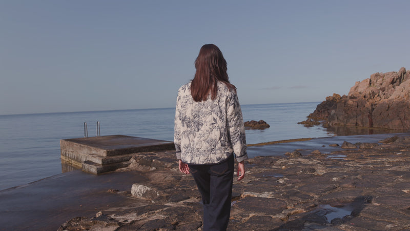 The Soyaconcept quilted jacket includes a round neckline, front buttons, and a striking botanical print with a quilted texture and striped edging. Pair it with dark jeans for an elegant look or with a simple skirt for a unique twist.