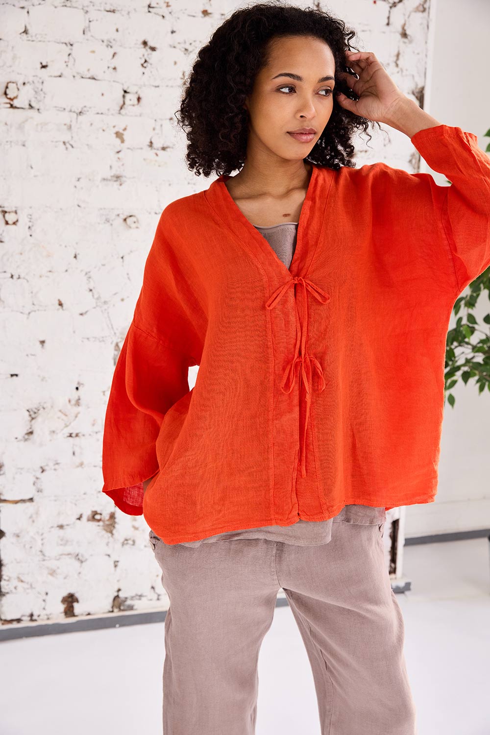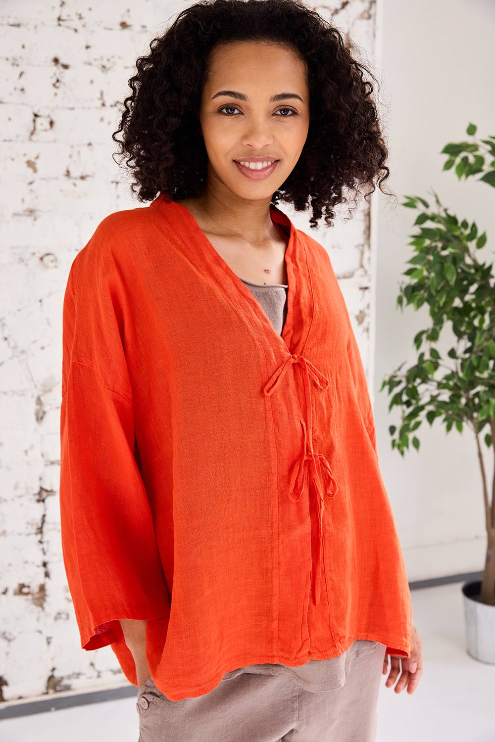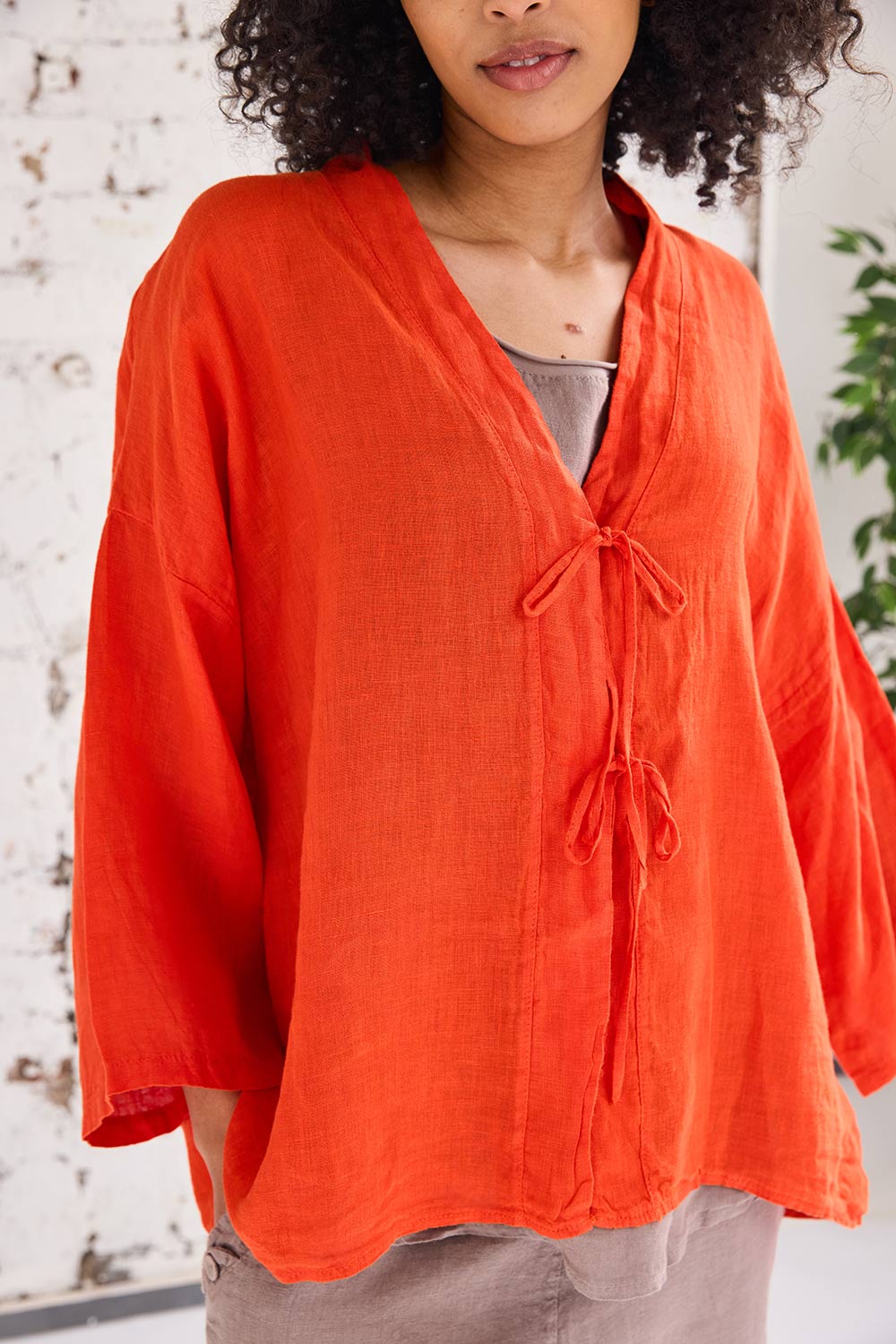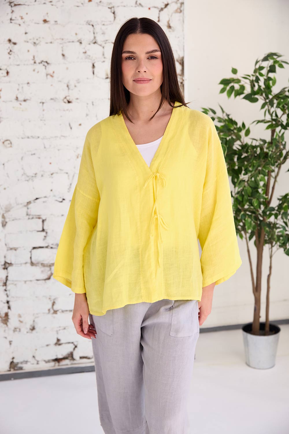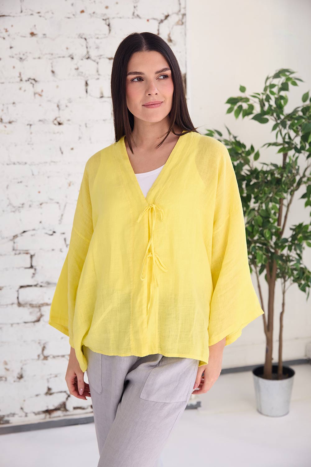 The ART bow detail top is the perfect lightweight linen cover for those breezy summer days, with its bow tie detail at the front, a flattering v-neck neckline and airy batwing sleeves, its the perfect piece for the season ahead.