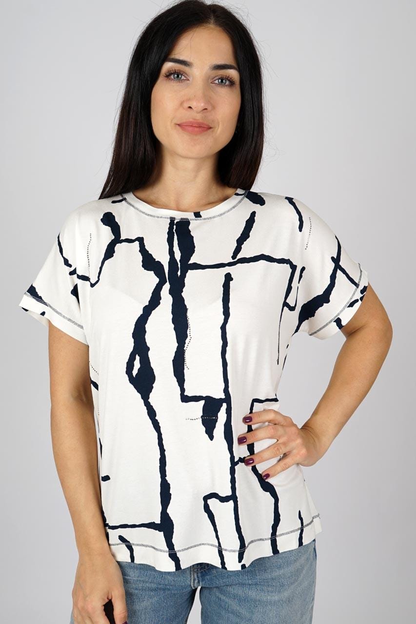 The Kartner abstract print top features a cracked mirror effect print in a flattering off-white and navy colour; with short sleeves and a round neckline, this piece is perfect to add to your wardrobe this season.
