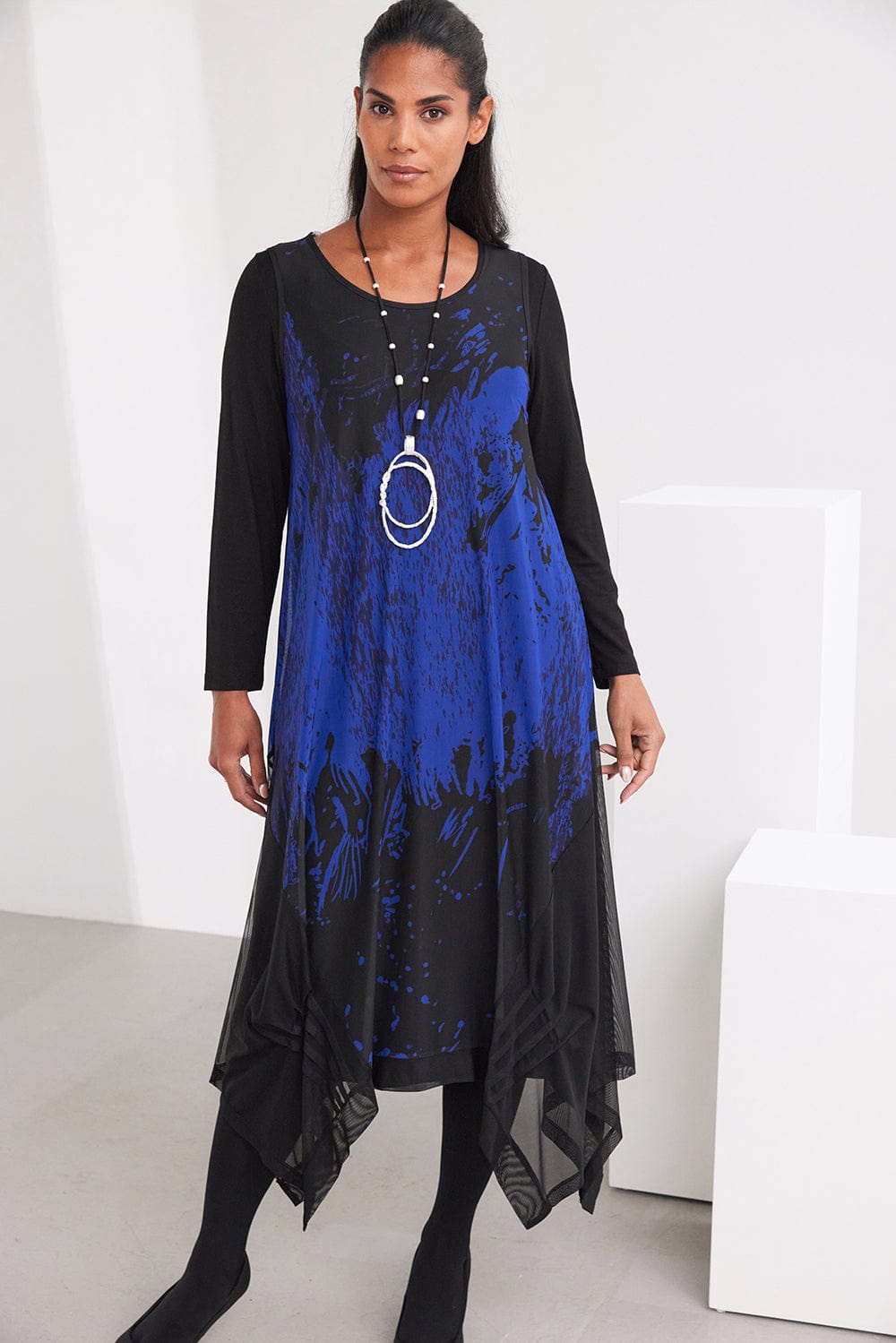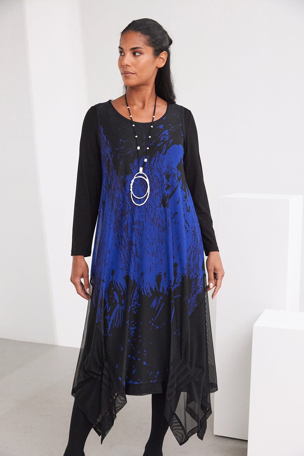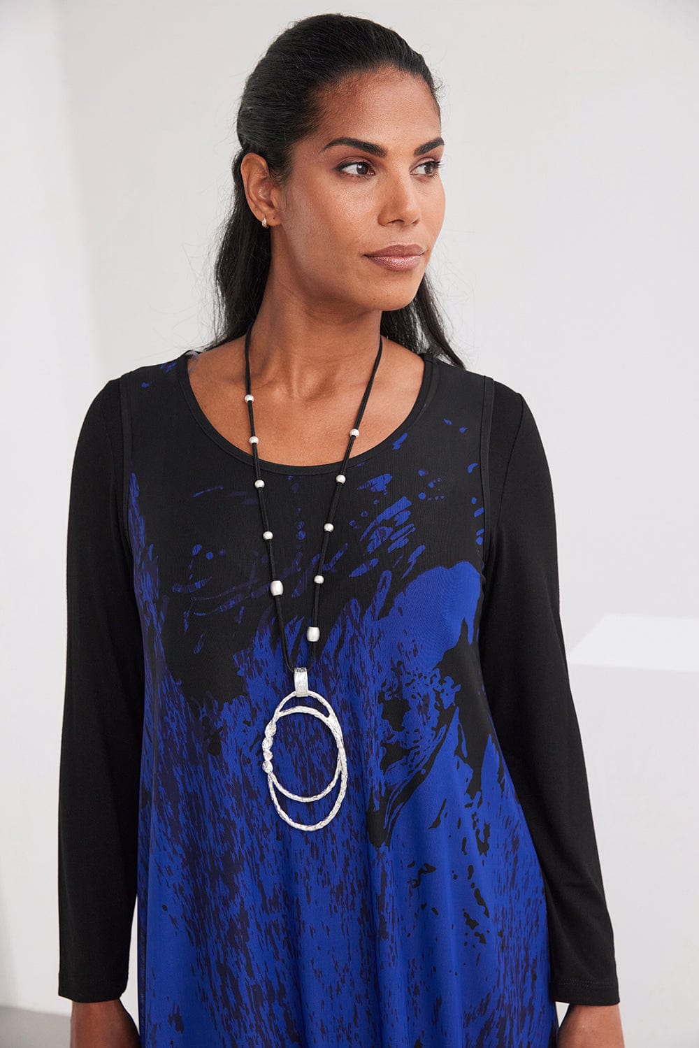 The Muireann necklace features striking silver accents set against a sleek black chain, highlighted by a bold circular centerpiece that commands attention.
