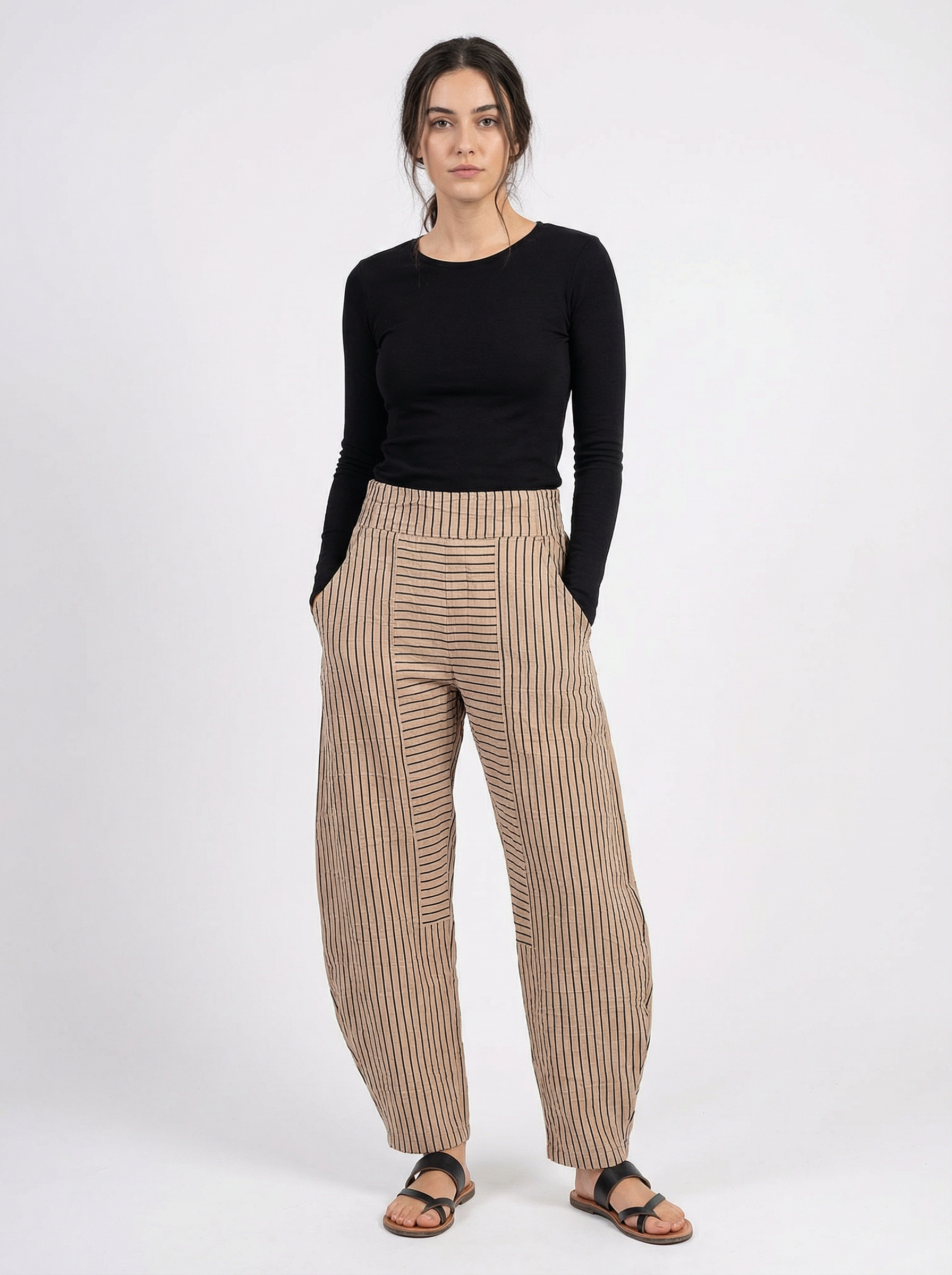 The My Soul crinkle barrel trousers are in a flattering barrel shape with a crinkle stripe design throughout.