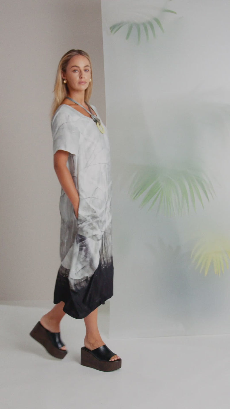 This NAYA long line stroke print dress with short sleeves is mystical and intriguing at the same time thanks to a beautiful vertical print. Fading upwards from the hem the print is reminiscent of an early morning summer mist. Short sleeves and a cut away neckline finish the look.