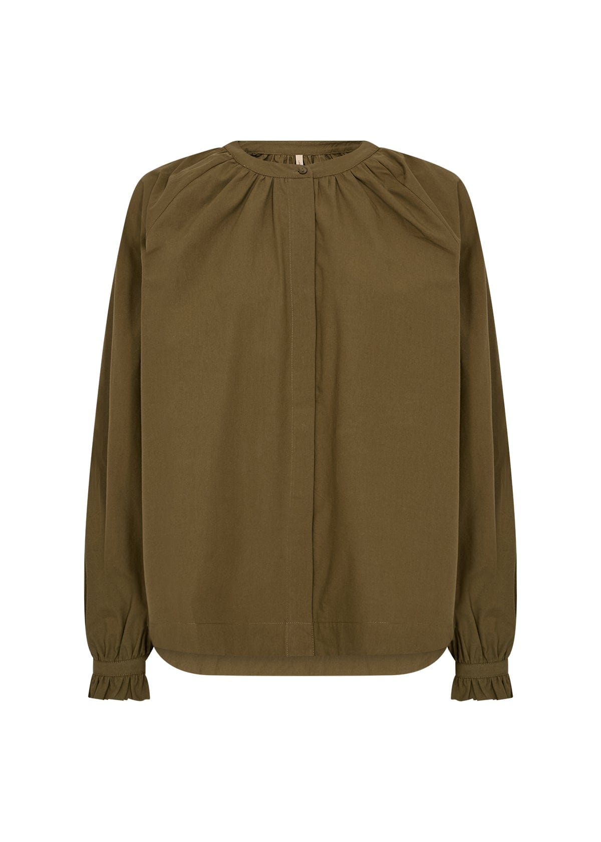 Soyaconcept shirt with pleated sleeve features a round collar, concealed buttons, and gathered details at the cuffs and shoulders, creating a stylish touch. Pair this shirt with tailored trousers or a skirt for a polished look.